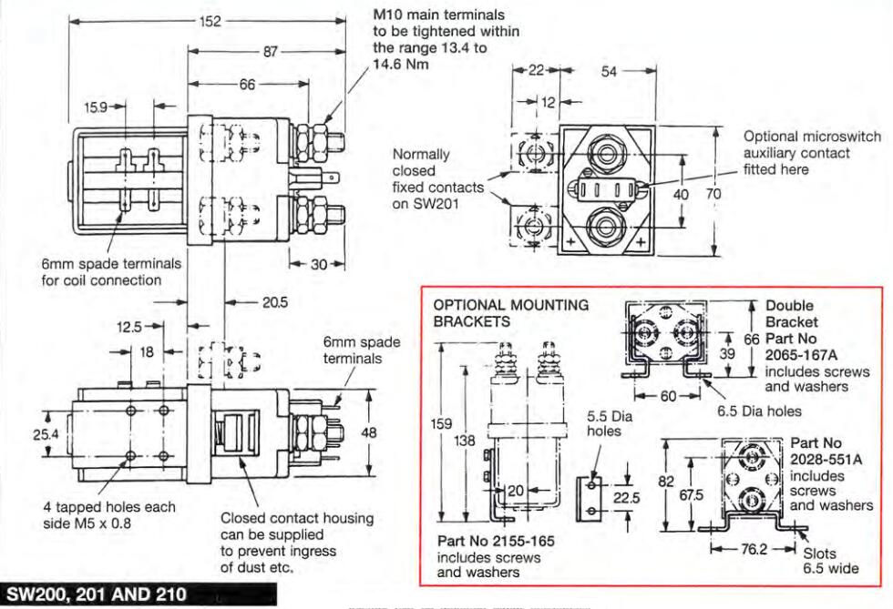 SW201设计用于直流负载,包括用于电动车辆(如工业卡车)的电机。SW201专为中断和不间断负载而开发,适用于切换电阻,电容和电感负载。SW201采用单刀双掷,双断主触头,银合金尖端,耐焊接,耐磨,导电性能优良。SW201具有M10螺柱主端子和6.3mm铲形线圈连接。它可以通过M5螺纹孔或安装支架安装 - 可以提供安装,也可以作为单独的项目安装。安装可以是水平或垂直,垂直时M10接触螺柱应朝上。如果要求是向下定向,我们可以调整接触器以补偿这一点。请注意,常闭触点不适合制造和断开负载。