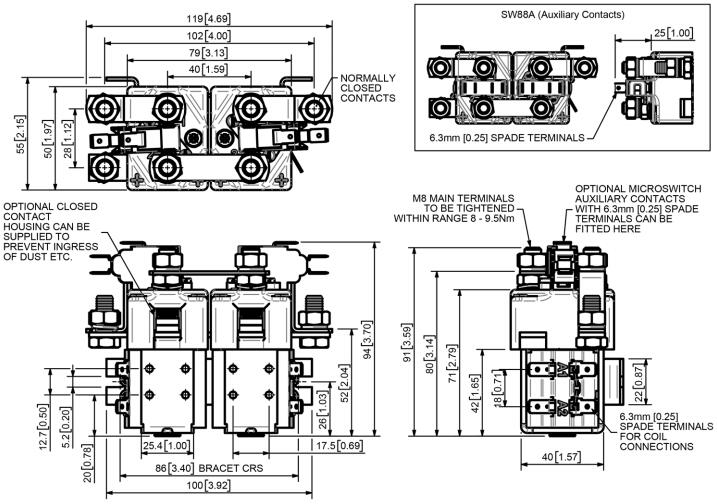 SW93的特点是单极双重断开主触点,银合金尖端,耐焊接,耐磨损,并具有优异的导电性。 SW93具有M8螺栓主端子和6.3mm的黑色线圈连接。 通过M4螺纹孔或安装支架进行安装,或者提供安装,或作为单独的物品。 安装可以是水平或垂直的,垂直时M8接触螺栓应该朝上。 如果要求向下定位,我们可以调整接触器来补偿这一点。